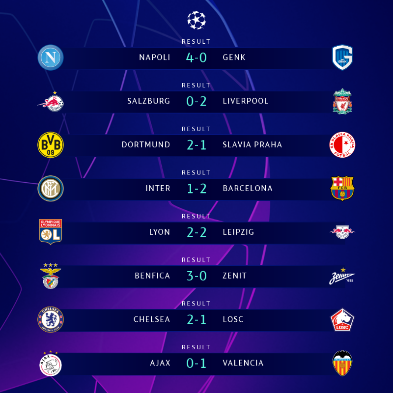 A pesar de que Ajax llegó a esta ronda como líder del Sector H, un gol de Rodrigo dio al Valencia el pase a la siguiente ronda de Champions como primer lugar del H. Por su parte, el Chelsea no tuvo problemas para firmar su clasificación para los Octavos de Final y lo hizo imponiéndose al Lille (2-1).