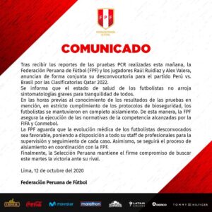 La FPF confirmó la desconvocatoria de ambos jugadores para el choque de este martes e informó que su estado de salud «no arroja sintomatologías graves para tranquilidad de todos». «En las horas previas al conocimiento de los resultados de las pruebas en mención, en estricto cumplimiento de los protocolos de bioseguridad, los futbolistas se mantuvieron en completo aislamiento», remarcó. La federación agregó que «aguarda que la evolución médica de los futbolistas desconvocados sea favorable» y añadió que «la selección peruana mantiene el firme compromiso de buscar este martes la victoria ante su rival».