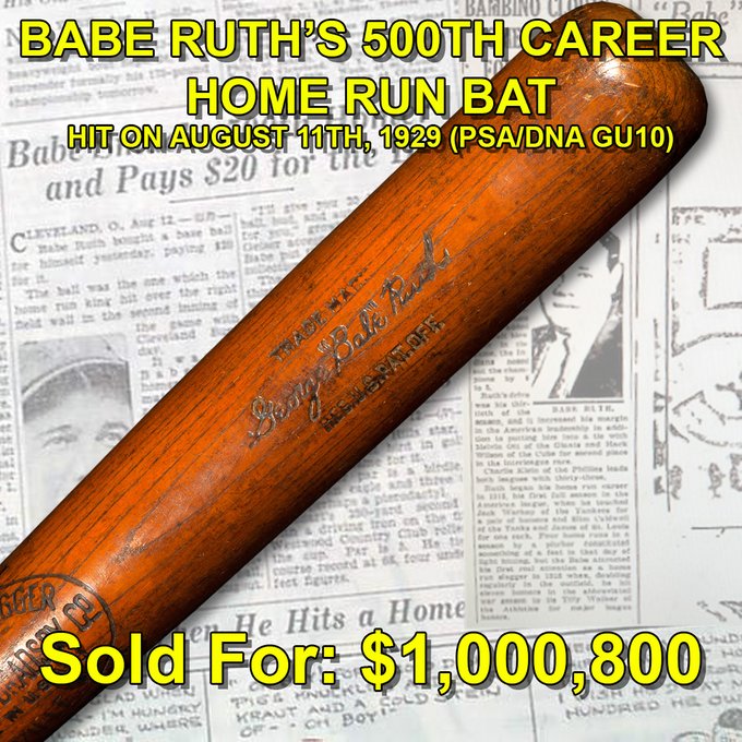 Babe Ruth la volvió a sacar del estadio. El bat usado por el legendario beisbolista para conectar su 500 cuadrangular fue subastado por más de un millón de dólares. SCP Auctions no identificó quien adquirió el bat en la subasta llevada a cabo en Laguna Niguel, California. Ruth pegó su jonrón 500 el 11 de agosto de 1929 en un partido ante los Indios de Cleveland. De acuerdo con SCP Auctions, la pelota pasó por encima del muro del jardín derecho del League Park y llegó hasta la Avenida Lexington. Ruth fue el primero de tan solo 27 peloteros de Grandes Ligas en alcanzar esa marca. Regaló el bat autografiado a su amigo y alcalde de Suffern, Nueva York, Jim Rice, en la década de 1940. La familia lo ha tenido durante cerca de 75 años. Otro bat que Ruth usó en el primer jonrón en el Yankee Stadium en 1923 fue vendido por aproximadamente 1.3 millones de dólares en 2004.