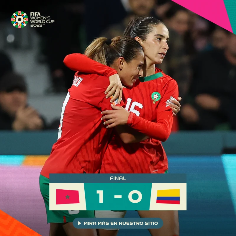 Chebbak, capitana y máxima goleadora de Marruecos, asumió la responsabilidad para cobrar la pena máxima, pero se topó ante la gran parada de Pérez. Para su alivio, el rebote fue convertido por Lahmari. En la segunda parte Marruecos se defendió ante el asedio colombiano y aguantó hasta celebrar el triunfo que le dio la histórica clasificación. En octavos de final se jugará contra Francia.