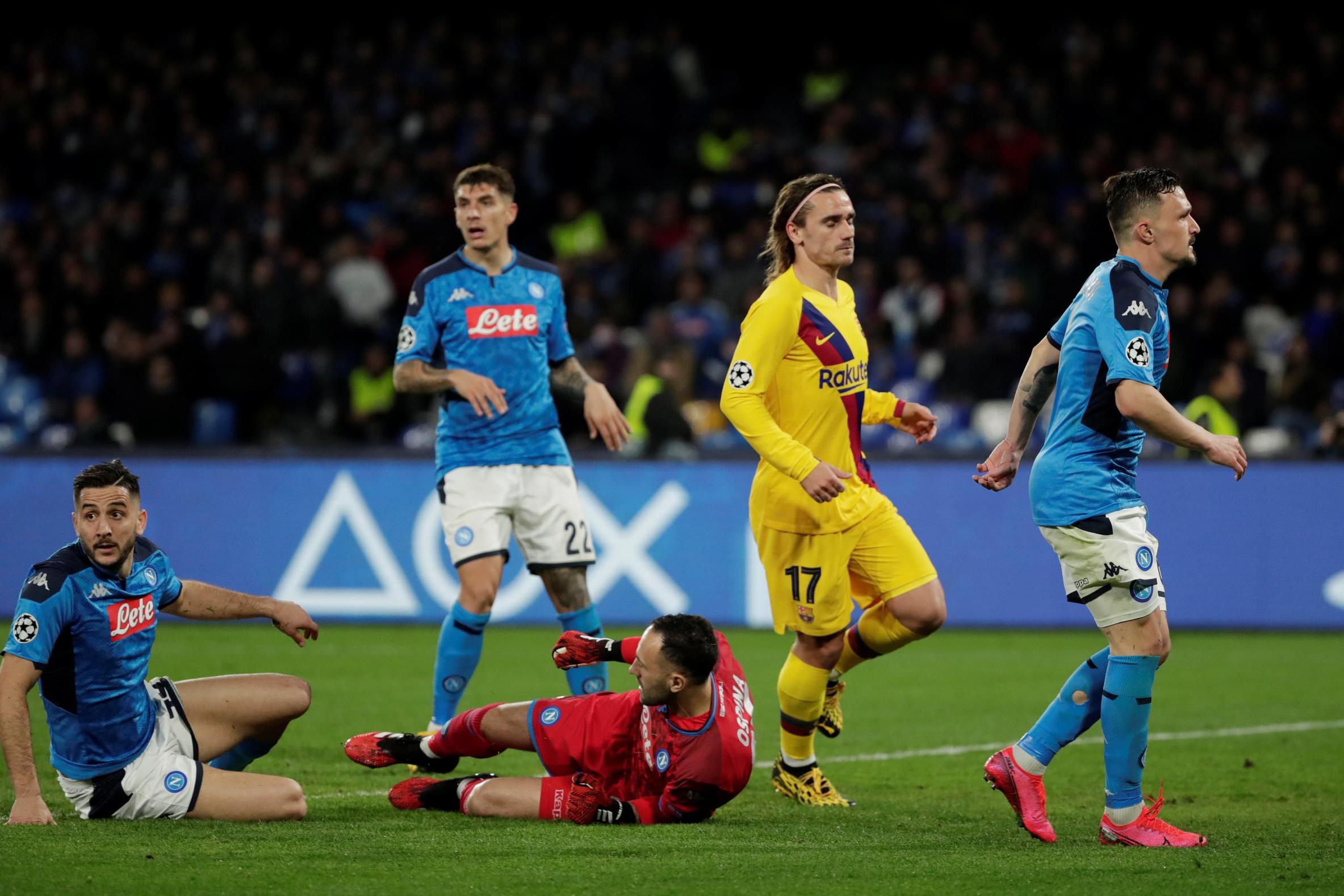 Necesitaba nuevas soluciones el Barcelona, en un San Paolo que rugía y que estuvo a punto de celebrar el segundo gol antes del descanso, cuando el griego Kostas Manolas, viejo conocido del conjunto barcelonista por haberle eliminado de la «Champions» con el Roma en 2018, remató fuera una asistencia del español José Callejón. No empezó de forma mejor la segunda mitad, con Busquets que vio una amarilla por frustración y que se perderá la vuelta por acumulación de tarjetas. Su falta provocó la lesión de Mertens, que fue obligado a pedir el cambio. Fue precisamente tras la salida del delantero belga del Nápoles que Busquets contó con más espacio y un magistral pase vertical liberó al portugués Nélson Semedo, quien ofreció a Griezmann el cómodo balón del 1-1 (m.57). Un partido hasta ese momento muy bloqueado tácticamente se volvió más imprevisible, con Insigne y Callejón que perdonaron el segundo gol napolitano y Messi que no consiguió rematar por pocos centímetros una asistencia del chileno Arturo Vidal y que acabó amonestado por arrollar involuntariamente al meta colombiano David Ospina.