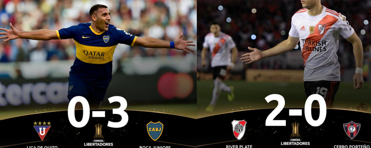 En el panorama de la competición esta semana tras los partidos de ida de cuartos de final, Boca Juniors goleó 0-3 como visitante al ecuatoriano Liga de Quito y River Plate venció en casa por 2-0 al paraguayo Cerro Porteño. En las series entre equipos brasileños, Flamengo ganó al Internacional 2-0 mientrasque Palmeiras derrotó 0-1 al Gremio. Los dos equipos de Porto Alegre perdieron y comprometieron su paso a la penúltima instancia del torneo. Las revanchas tendrán lugar la semana venidera, así: el martes 27 Palmeiras recibirá a Gremio, el miércoles 28 Boca será local contra Liga de Quito e Internacional ante Flamengo, mientras que el jueves 29 River visitará a Cerro Porteño. El Video de Asistencia Referil concedió a River Plate dos penaltis que le permitieron batir 2-0 a Cerro Porteño, el primero por mano y el segundo por infracción. Sin embargo, también le anuló un gol, con el marcador parcial 1-0, por mano del atacante argentino Matías Suárez.