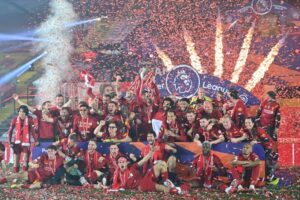 Mientras que los aficionados reunidos afuera del estadio iluminaron el cielo con la pirotecnia, el Liverpool y Chelsea proporcionaron sus propios momentos explosivos en un emocionante duelo que incluyó ocho goles. Un triunfo por 5-3, antes de recibir el trofeo de campeón de la Liga Premier y con goles de ocho jugadores distintos, constituyó una forma agradable para que el Liverpool despidiera la temporada en Anfield el miércoles.