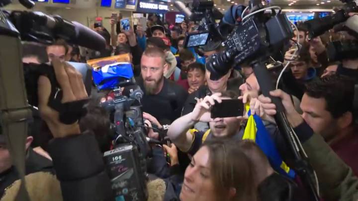 De Rossi es el cuarto fichaje en este mercado de pases de Boca Juniors, que también incorporó a Eduardo Salvio (Benfica), a Alexis Mac Allister (Argentinos Juniors) y al venezolano Jan Hurtado (Gimnasia y Esgrima La Plata). Cientos de exaltados y emocionados hinchas recibieron a Daniele en el aeropuerto de Ezeiza con cánticos y gritos de apoyo. «Miren qué emoción, ese es el famoso ‘tano’ (modo de referirse a los italianos en Argentina y Uruguay) que vino a La Boca para ser campeón», fue uno de las canciones que le dedicaron los fanáticos, que se agolparon y empujaron para intentar conseguir una foto con el campeón del mundo.