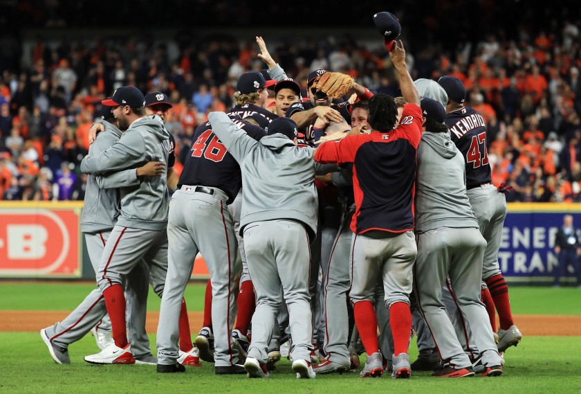 Howie Kendrick y Anthony Rendón dispararon sendos jonrones en el séptimo inning y los Nationals de Washington remontaron una desventaja de dos carreras y vencieron 6-2 a los Astros de Houston, con lo cual se coronaron en la Serie Mundial por primera vez en la historia de la franquicia. Con todos los ojos puestos en el pitcher Max Scherzer y su notable recuperación tras recibir inyecciones de analgésicos, los Nationals aprovecharon su debut en un Clásico de Otoño donde el equipo visitante ganó cada uno de los siete duelos, algo inédito en la historia de las Grandes Ligas y de las principales ligas deportivas profesionales de Estados Unidos.