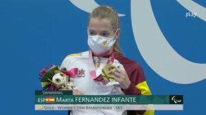 Marta Fernández, de 27 años, debutó internacionalmente esta temporada y pasó en Sheffield (Reino Unido) la clasificación internacional que le permitió competir en los Juegos Paralímpicos, recibiendo las clases S4, SB3 (para braza) y SM4 (para estilos). La deportista burgalesa del CD Fusión refrendó su excelente progresión como nadadora con una medalla en Tokio, esta vez en los 50 metros braza, en una carrera que dominó desde el principio parando el cronómetro en 58.21, dos segundos menos que la rusa Natalia Butkova, que se colgó la plata. El bronce fue para la mexicana Nely Miranda Herrera.