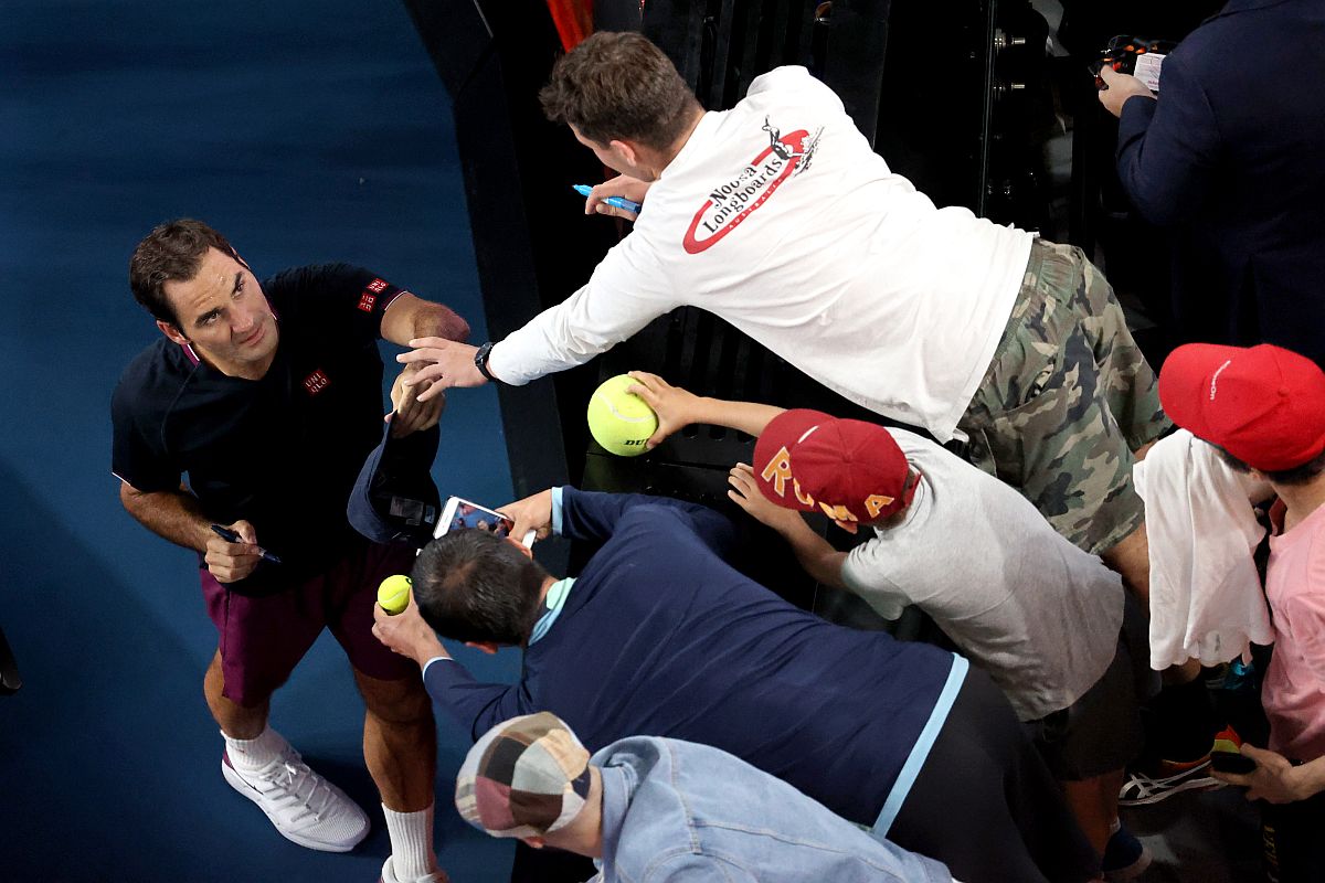 Switzerland’s Roger Federer gives autographs to spectators after his men’s singles match against Serbia’s Filip Krajinovic on day three of the Australian Open tennis tournament in Melbourne.