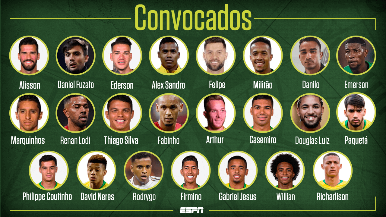 De la Liga española proceden 8 de los 23 convocados: Renan Lodi y Felipe, ambos defensas del Atlético de Madrid; Rodrygo, Eder Militao y Casemiro, del Real Madrid; Arthur, del Barcelona y Philippe Coutinho, cedido por el club azulgrana al Liverpool, y el lateral Emerson del Betis. Tite, en una rueda de prensa dijo que «Son partidos de preparación antes de comenzar las eliminatorias y por eso podemos darle la oportunidad por primera vez a jugadores jóvenes para ver cómo se integran al equipo», afirmó. Neymar sufrió una lesión en la pierna izquierda este mes precisamente cuando disputaba un amistoso de Brasil en Nigeria. En su próximo amistoso, Brasil y Argentina llevarán el tradicional clásico sudamericano a Riade (Arabia Saudí) el 15 de noviembre próximo. Cuatro días después Brasil se medirá a Corea del Sur en Abu Dhabi (Emiratos Árabes Unidos). En dos amistosos disputados en Estados Unidos, Brasil empató 2-2 con Colombia y cayó por 1-0 frente a Perú, precisamente su víctima en la final de la Copa América, y en otros dos disputados este mes en Singapur empató 1-1 tanto con Senegal como con Nigeria.
