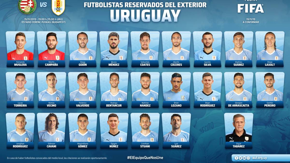 Luis Suárez, Edinson Cavani y Giorgian De Arrascaeta regresaron a la lista de convocados del exterior por el seleccionador de Uruguay, Óscar Washington Tabárez, para el partido amistoso ante Hungría que se disputará el próximo 15 de noviembre en Budapest. Los delanteros Suárez y Cavani se perdieron los partidos ante Perú por molestias musculares, mientras que el mediocampista del Flamengo también estuvo ausente de estas fechas por una lesión en la rodilla izquierda. También regresan a la convocatoria Celeste el delantero Christian Stuani, el volante Gastón Pereiro y los defensores Bruno Méndez y Mathías Suárez.