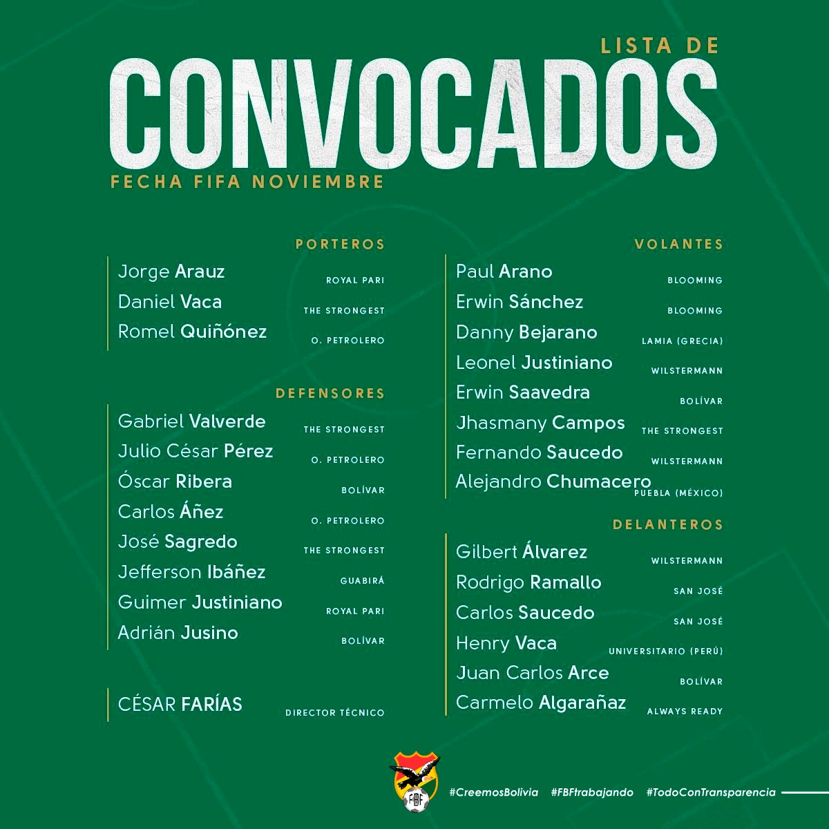 Con el regreso de Danny Bejarano a la Verde luego de un año de ausencia, César Farías dio la nómina de convocados a la selección boliviana que jugará el próximo 15 de noviembre contra Chile y luego el 19 frente a Panamá, en su dos últimos juegos del año. Mediante sus redes sociales, la Federación Boliviana de Fútbol hizo conocer la lista de 25 jugadores convocados a la selección nacional en la que está incluido Bejarano, quien milita en el club Lamia, de la primera división de Grecia. Bejarano tuvo un buen año en esta temporada porque fue tomado en cuenta en el club griego desde los primeros partidos y esa continuidad fue una de las causas para que regrese a la Verde casi luego de un año de ausencia.